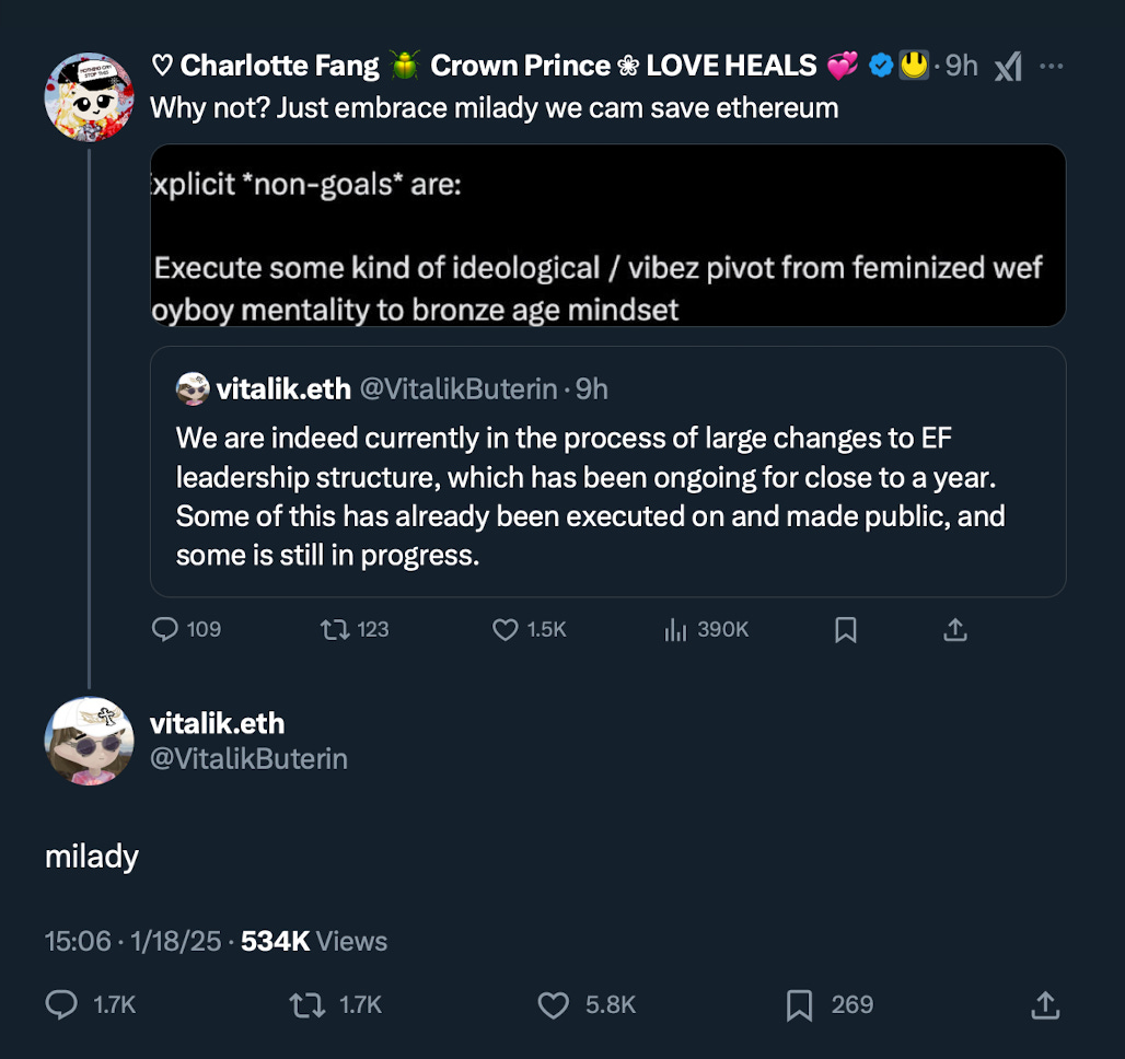 (Vitalik dropped his mini-manifesto on how he is going to work on Ethereum, and Charlotte Fang, the founder of the Milady project where this unique art style initially started on Ethereum, suggested that Vitalik should just embrace Milady. This was a signal to the outer world that he was still listening to the community and wanted to embrace the culture. Then, in January 2025, Vitalik changed his PFP to a Milady (@MiladyMaker on X). Milady is currently trading around 4 ETH, which is about $10,000 USD. This gives the collection an approximate valuation of around $100M if we multiply the floor price of 4 ETH by 10,000, the size of this art collection. Milady is considered a blue-chip in the Ethereum NFT eco.)